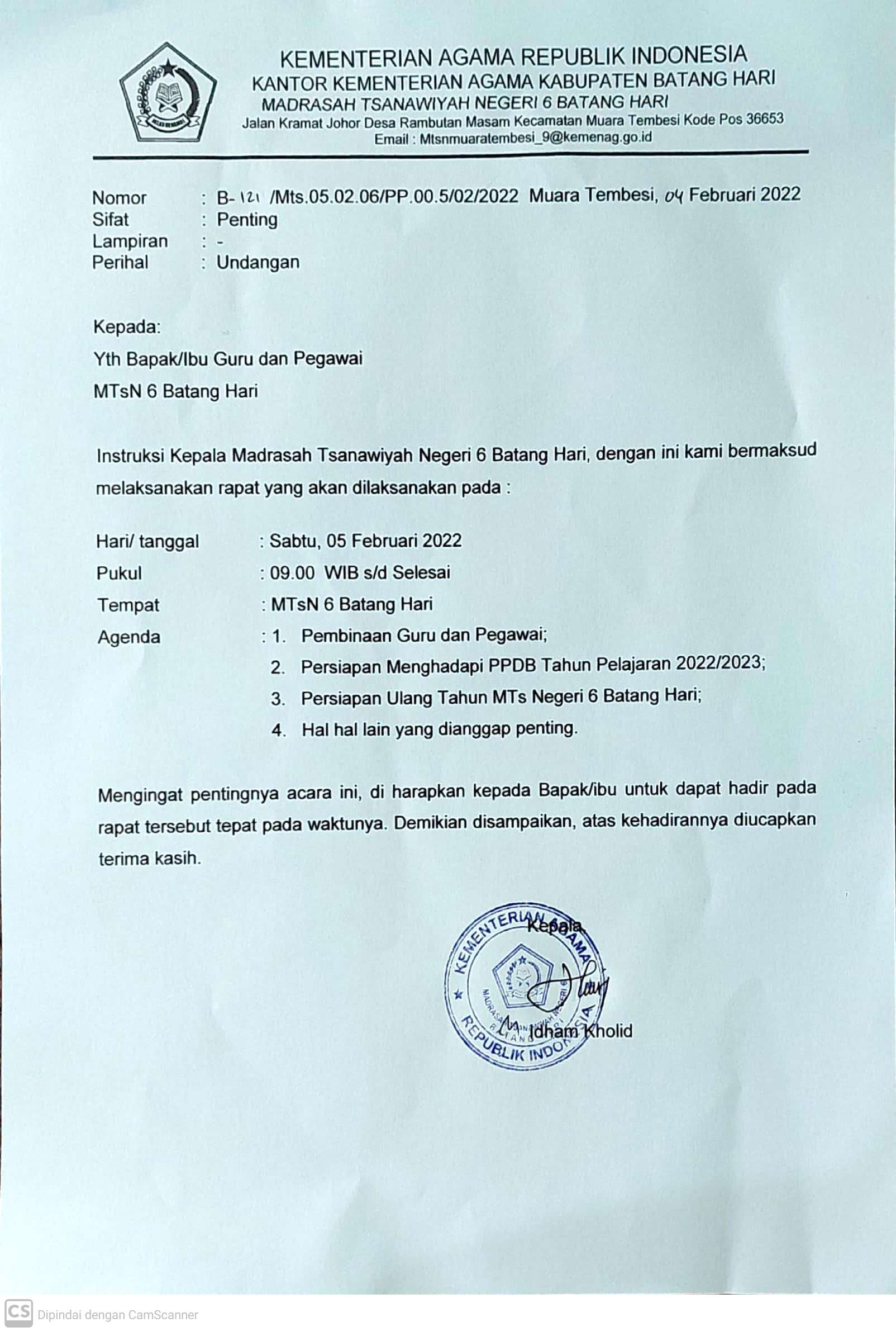 Undangan Kegiatan Pembinaan Anggota KKM MTsN 6 Batang Hari