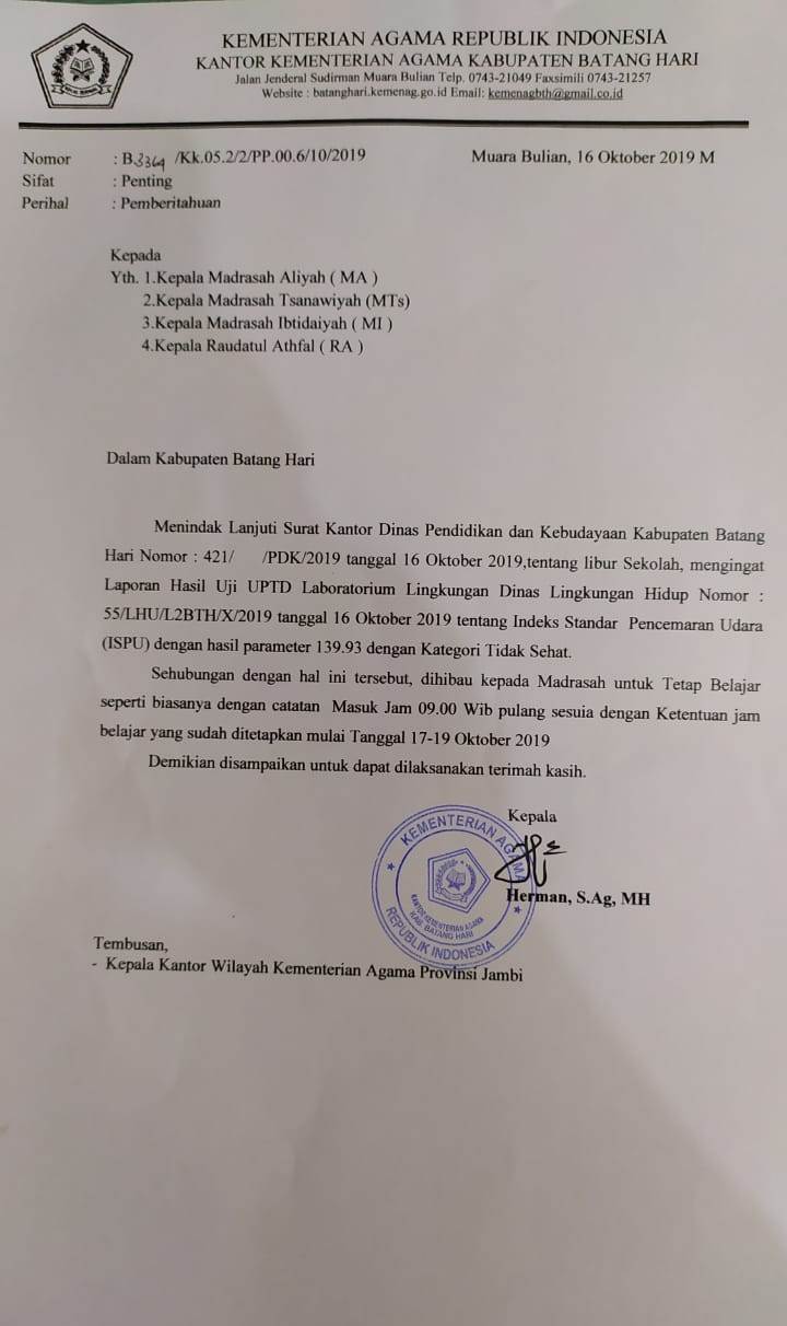 Surat Libur Madrasah Tanggal 16 s.d 18 September 2019