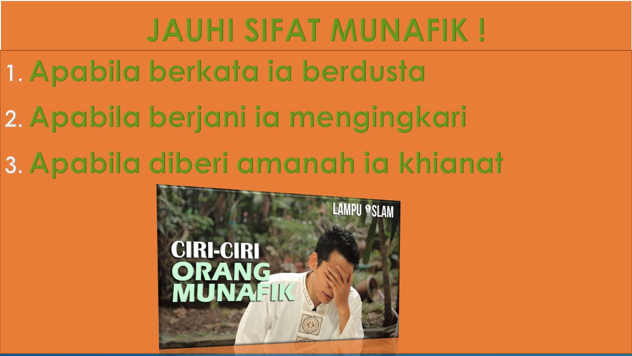 Seperti kita ketahui bersama bahwa munafik adalah sifat berpura-pura percaya atau setia kepada agama, tetapi sebenarnya dalam hatinya tidak. Sehingga perbuatan seperti ini harus dihindarkan dan dijauhi dari kehidupan kita semua. Baik di lingkungan MTsN 6 Batang Hari maupun ketika kita sudah berada di rumah dan di tengah masyarakat.