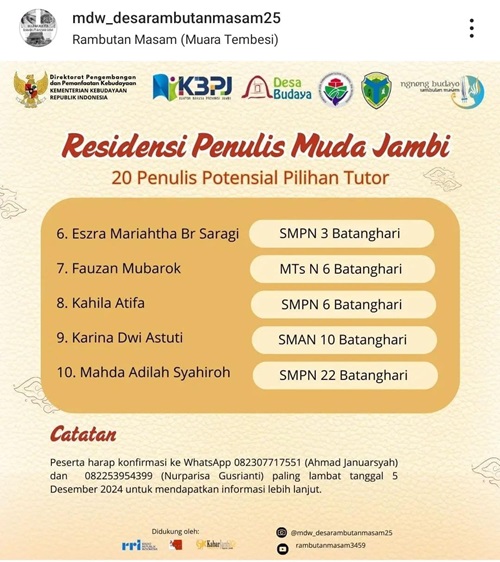 Beberapa hari lalu tepatnya Kamis (28/11/2024) MTsN 6 Batang Hari telah mengirimkan 6 orang siswa untuk mengikuti lomba menulis cerpen dalam rangka Ngneng Budayo di Desa Rambutan Masam pada tahun ini. Akhirnya malam tadi tepatnya hari Selasa (03/12/2024) telah diumumkan 20 penulis potensial pilihan tutor melalui Instagram mdw_desarambutanmasam25.