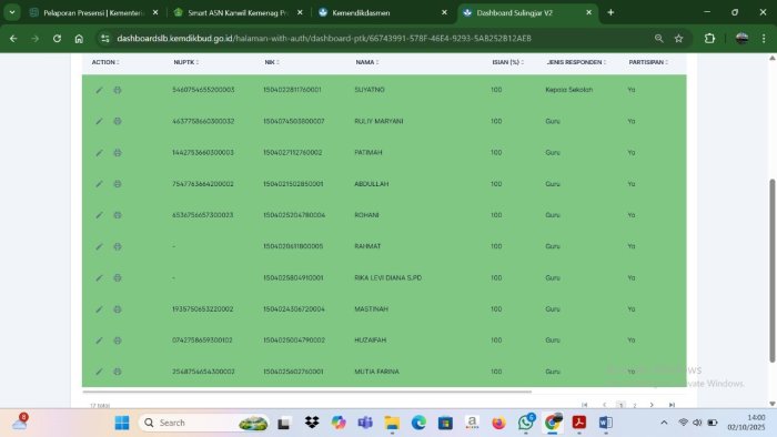 Namun, semangat disiplin dan kekompakan guru MTsN 6 Batang Hari patut diapresiasi. Tanpa menunggu batas waktu, seluruh guru bersama Kepala Madrasah telah menyelesaikan pengisian Sulingjar 100% tuntas lebih awal, tepat di bulan September 2025. Hal ini menunjukkan komitmen kuat dalam mendukung kelengkapan data pendidikan nasional.