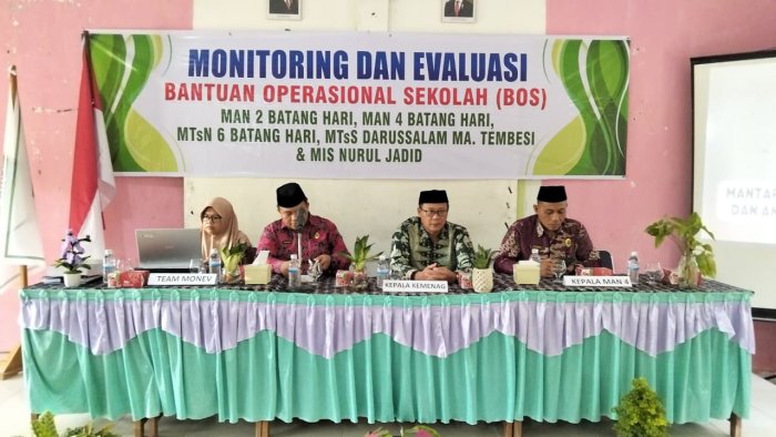 Kegiatan monev ini diselenggarakan oleh Kantor Kementerian Agama Kabupaten Batang Hari sebagai bentuk pengawasan dan pembinaan terhadap pengelolaan dana BOS di madrasah. Monev diikuti oleh beberapa satuan pendidikan madrasah, di antaranya MAN 4 Batang Hari, MAN 2 Batang Hari, MTsNegeri 6 Batang Hari, MTs Darussalam Muara Tembesi, dan MIS Nurul Jadid Muara Tembesi.