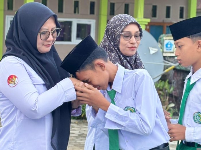 Acara dimulai setelah pelaksanaan apel pagi. Seluruh siswa tampak berbaris rapi untuk bersalaman dengan para guru dan tenaga kependidikan. Satu per satu siswa menyalami guru dengan penuh rasa hormat, sementara para guru menyambut mereka dengan senyum hangat. Selain itu, para siswa juga saling berjabat tangan satu sama lain, menciptakan suasana yang penuh keakraban dan kebersamaan.